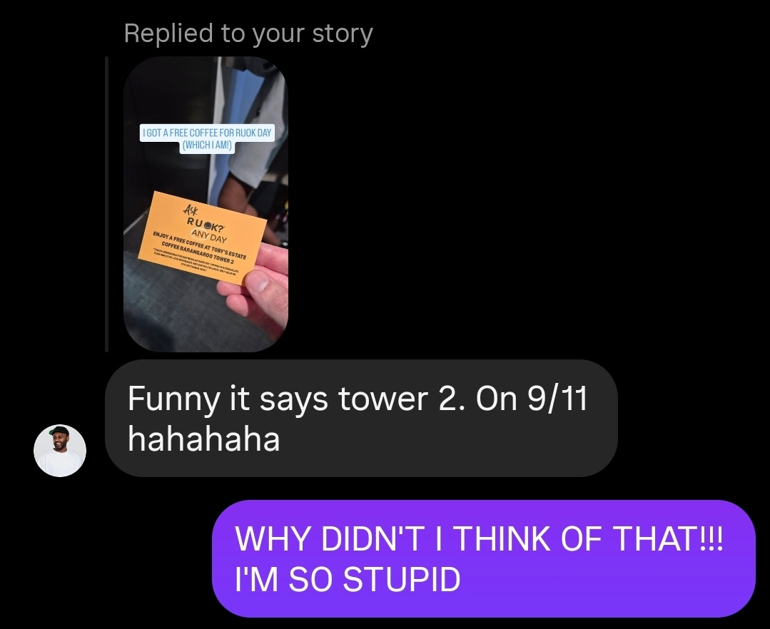I timed my last day to be on 11/9 because it makes me laugh, which also happened to be RUOK Day which, unlike most observers of 9/11, I certainly was. My motivations in life are to follow the shiny thing first, fix my brain second.